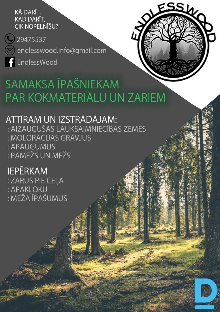 PIEMAKSA ĪPAŠNIEKA PAR KOKMATERIĀLU UN ZARIEM DARBOJAMIES 150KM AP RĪGU ATTĪRAM UN IZSTRĀDĀJAM: - AIZAUGUŠAS LAUKSAIMNIECĪBAS ZEMES - MELORĀCIJAS GRĀVJUS - APAUGUMUS - PAMEŽU UN MEŽU IEPĒRKAM: - ZARUS PIE CEĻA - APAĻKOKU - MEŽA ĪPAŠUMUS |